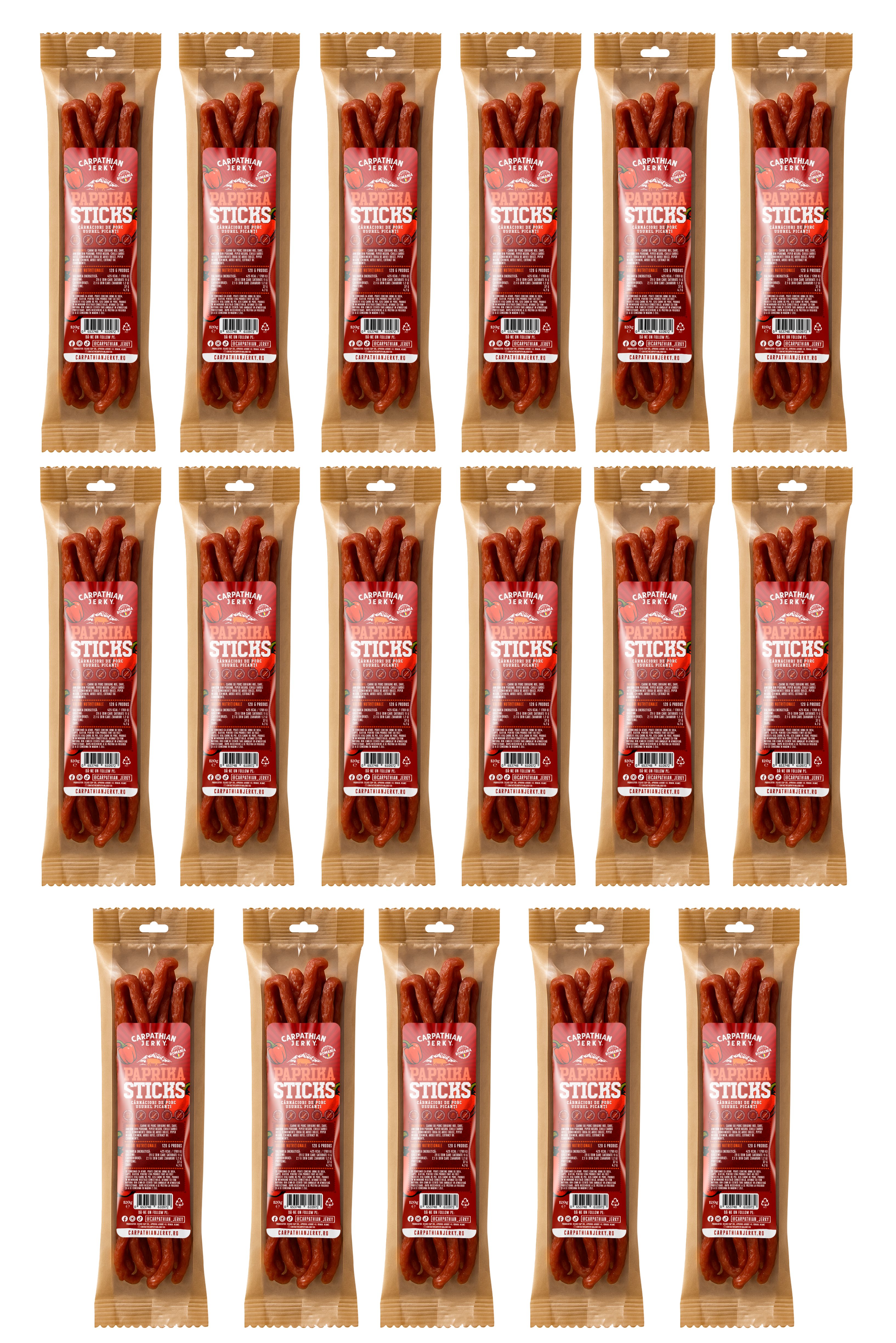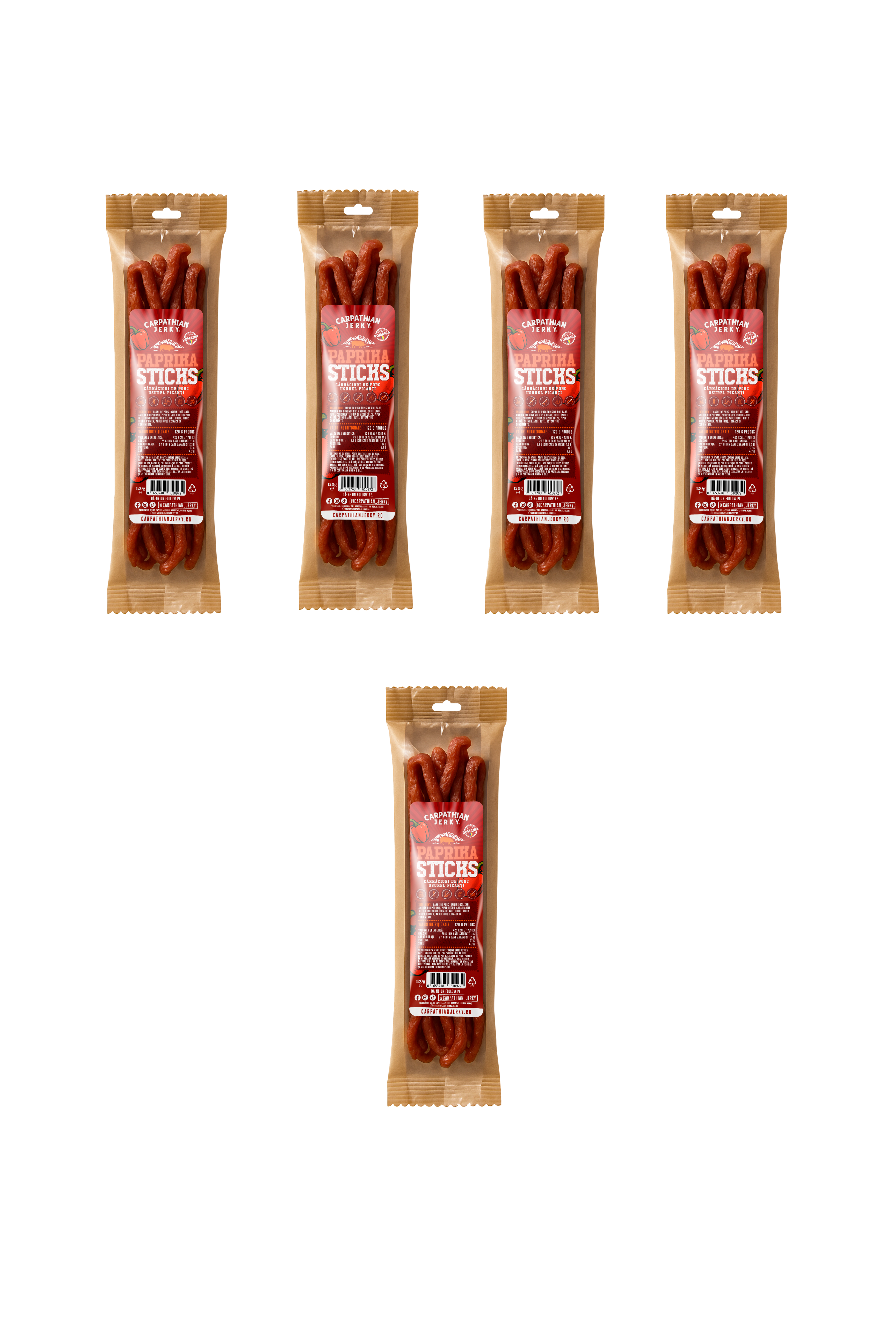 Paprika Sticks από ρουμανικό χοιρινό, καρυκευμένα με γλυκιά πάπρικα, τσίλι και πιπέρι, αποξηραίνονται αργά για να διατηρήσουν το αυθεντικό τους άρωμα και τη μαλακή τους υφή. Καπνισμένα φυσικά με ξύλο σκληρής ξυλείας, αυτά τα μπαστούνια συνδυάζουν την παράδοση των Καρπαθίων με μια πικάντικη νότα που διεγείρει την όρεξη. Χωρίς γλουτένη, μη ΓΤΟ, πλούσια σε πρωτεΐνη — το καθαρό σνακ, με χαρακτήρα, που σε συνοδεύει παντού.